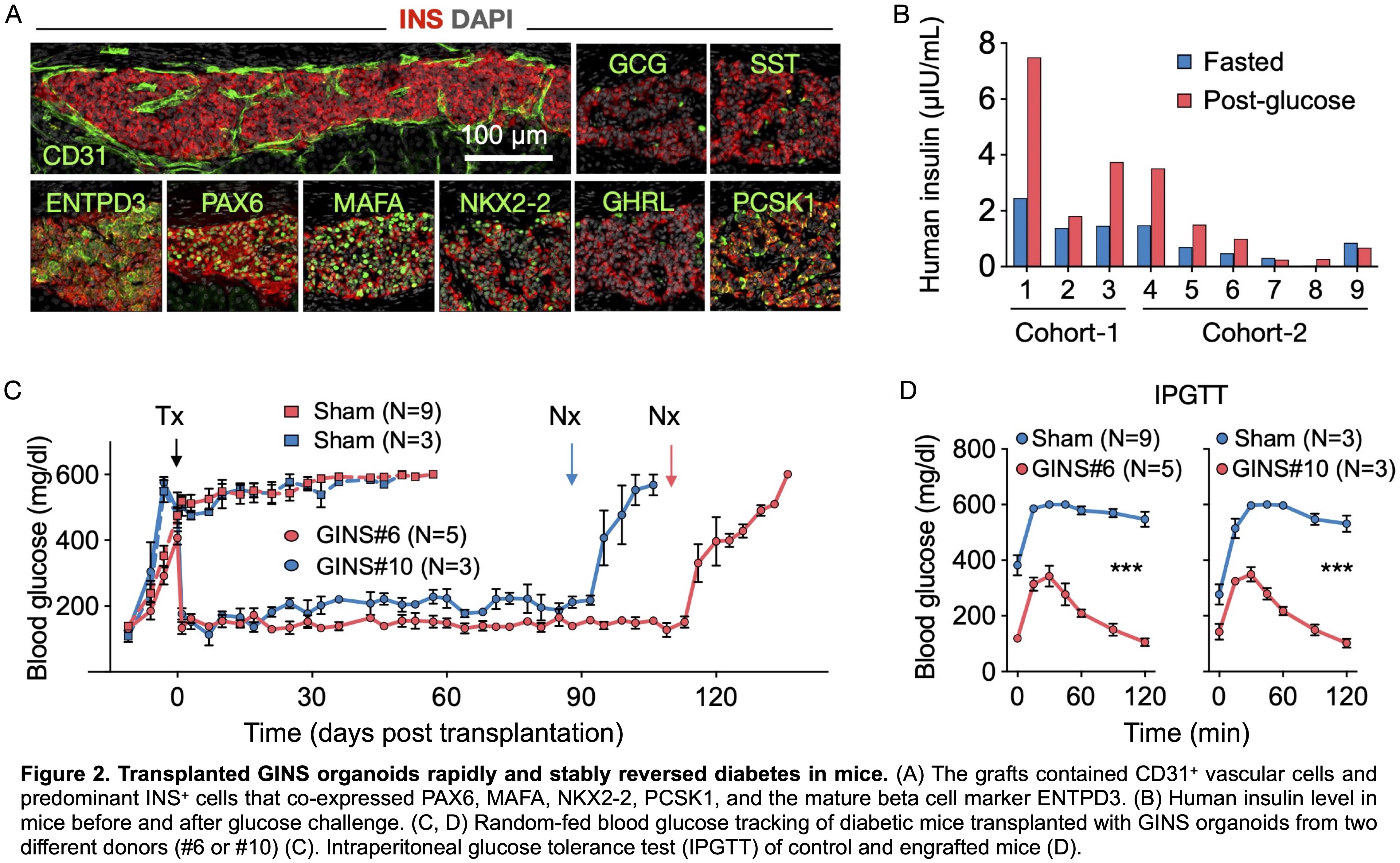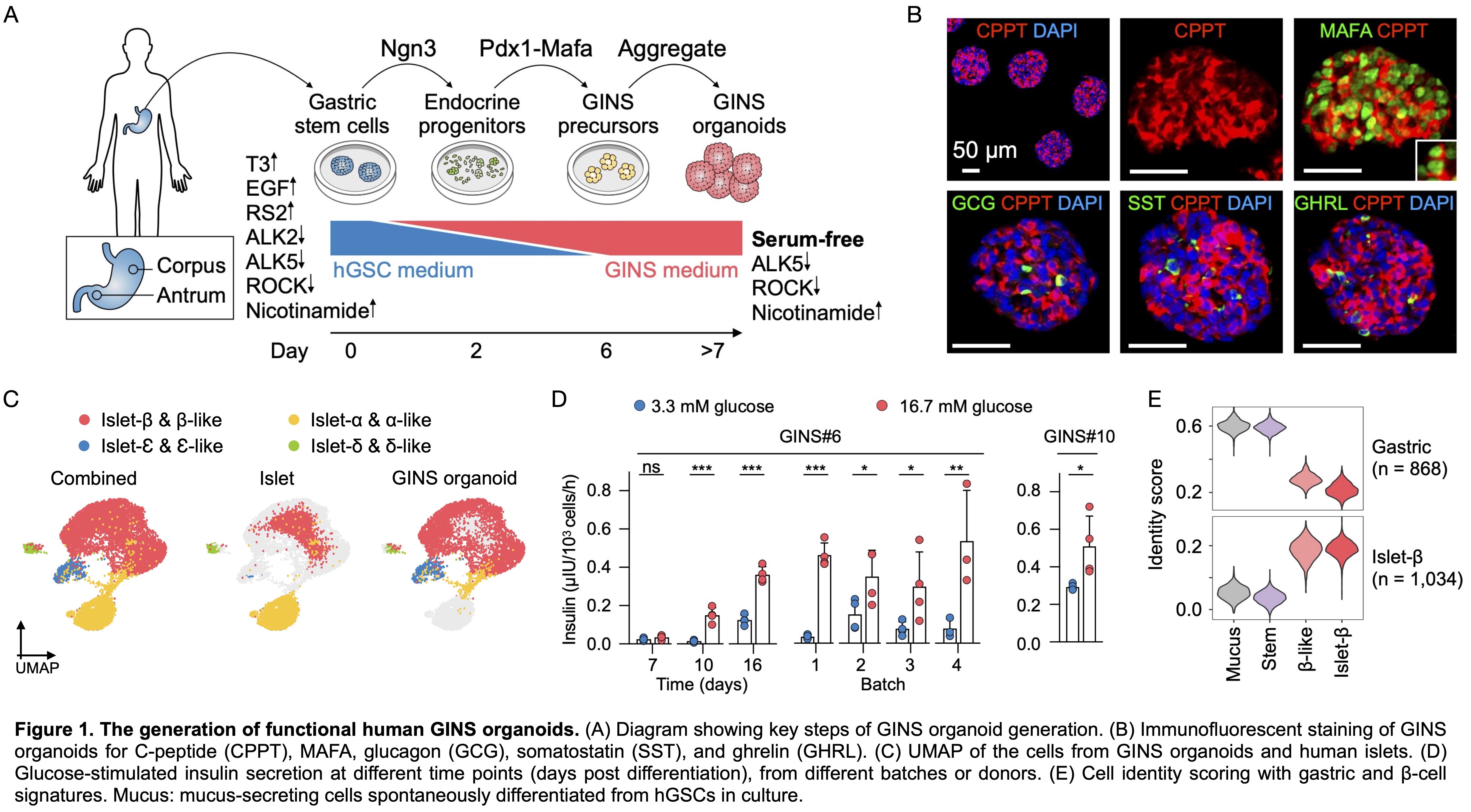 Primary hGSCs derived from stomach biopsy or autopsy samples were expanded as colonies in culture. Sequential activation of the inducing factors NGN3 and PDX1-MAFA led to the formation of the GINS organoids (Fig. 1A). Functionality of GINS organoids were evaluated by statistic and dynamic glucose-stimulated insulin secretion (GSIS) assays. Transplantation study was conducted to evaluate their functionality in vivo including GSIS, glycemic control and glucose tolerance. scRNA-seq was performed to characterize the molecular profiles of GINS organoids before and after engraftment in comparison with human islets.