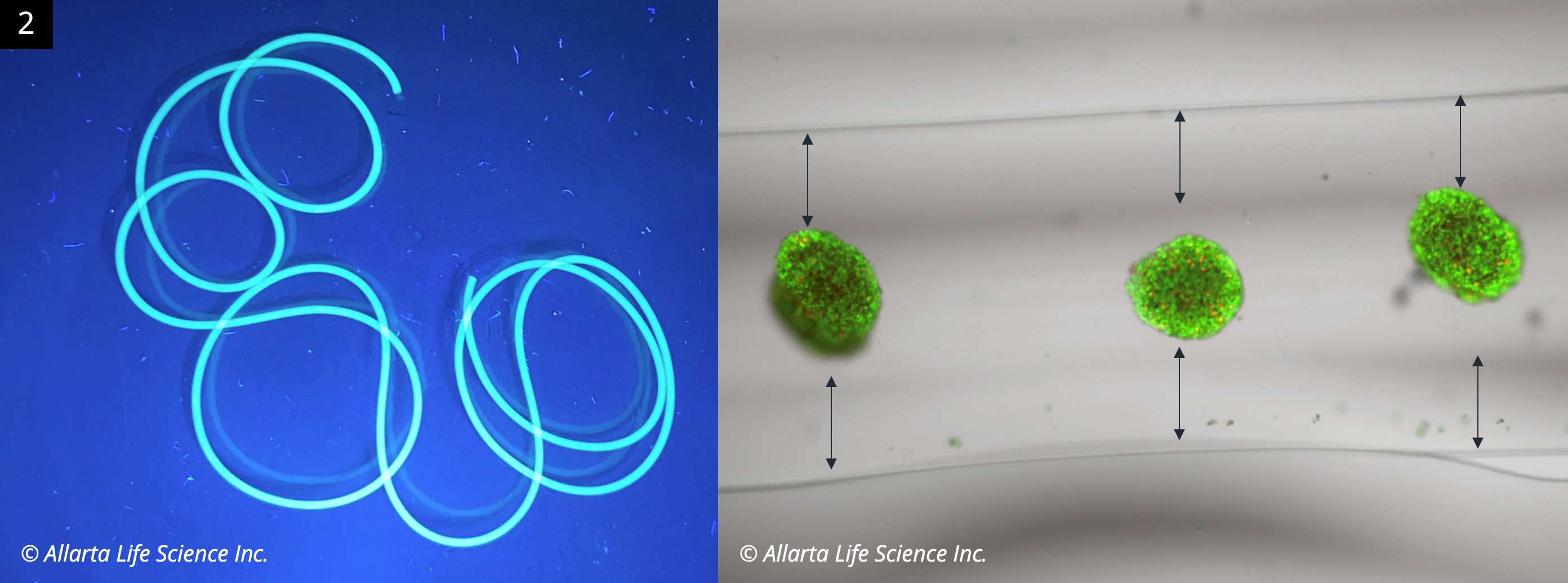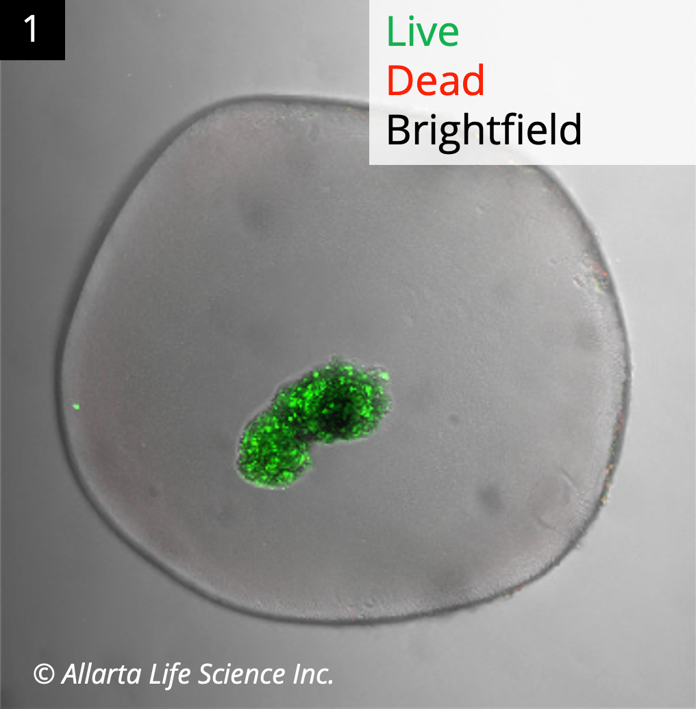 The technology supports arbitrary hydrogel shapes with centered placement of Islets (Figure 2, Live/Dead-stained Islets in gel string).