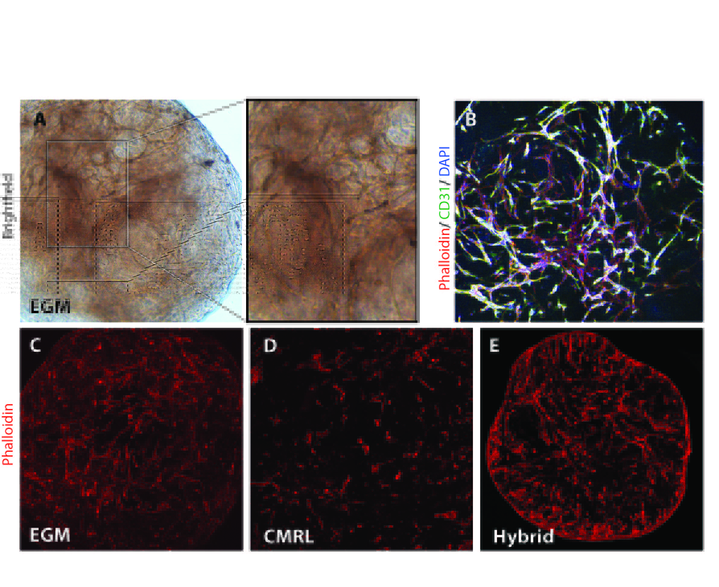 Results: ECs cultured in hP-HG in EC growth medium (EGM) formed 3-D tubes covering 29% of the area of a max-intensity image (Fig 1C). In islet medium (CMRL), the percentage was reduced (14.2%) (Fig 1D), but when cultured in a hybrid medium combining EGM with CMRL, the coverage was 31.7% (Fig 1E). This methodology enables the co-culture of endothelial tubes with islets in hP-HG for several days (Fig. 2A). Islets cultured in the IVEG construct had a significantly improved stimulation index (SI = 10.0) compared to the same donor islets cultured in standard suspension culture (SI = 2.1). IVEG constructs were transplanted following 3 days of culture and EC network formation.