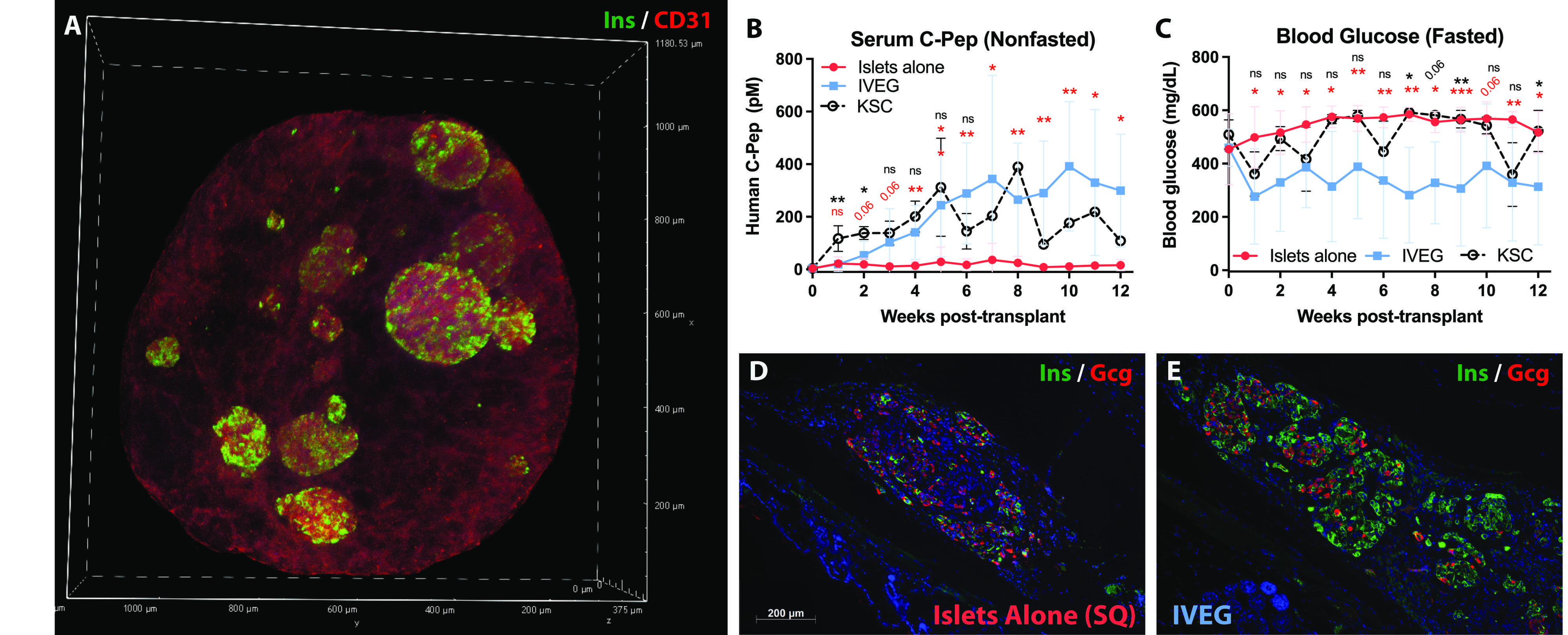 1000 IEQ were transplanted in diabetic immunodeficient mice (NSG RIP-DTR) alone subcutaneously (SQ), alone  under the kidney subcapsule (KSC), or SQ within IVEG constructs.